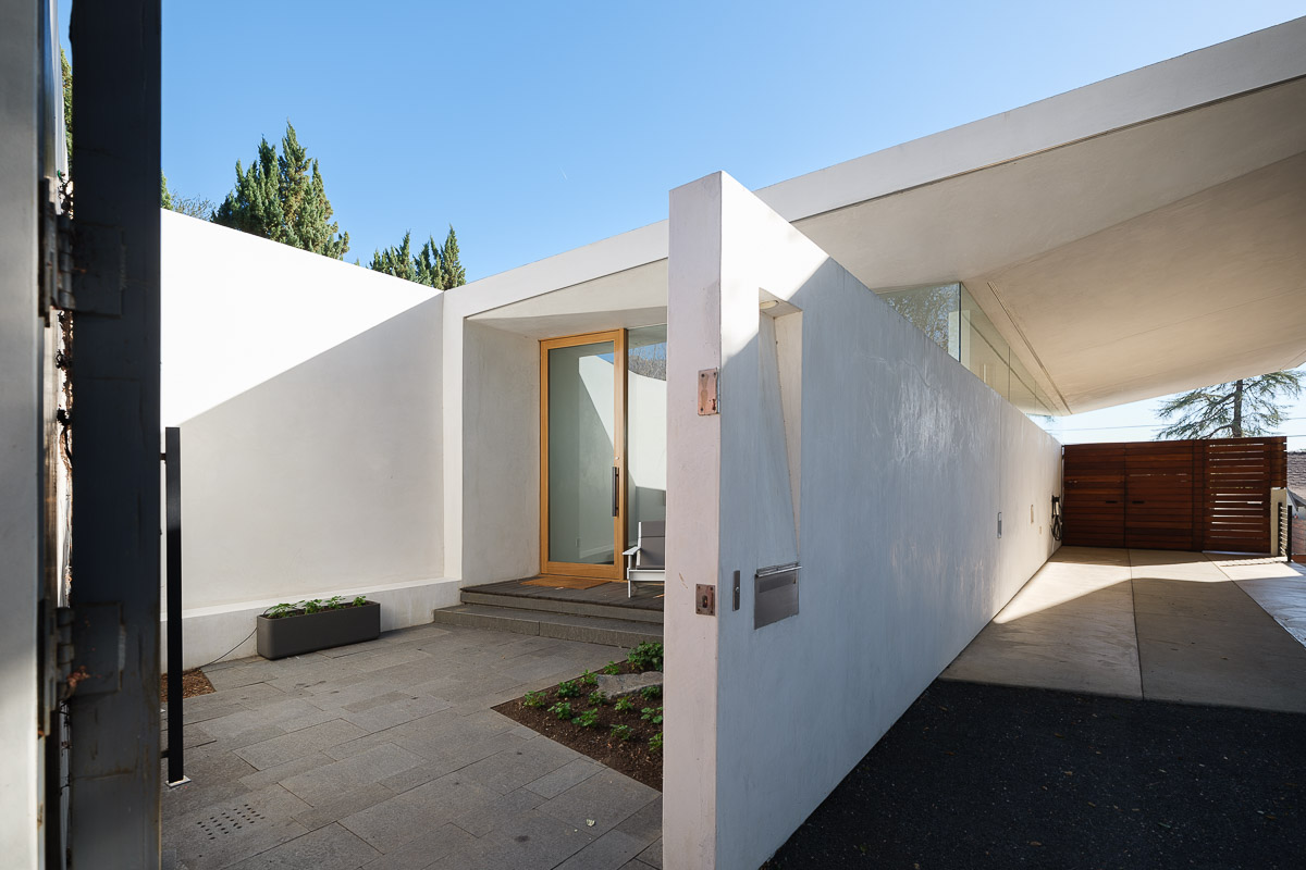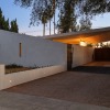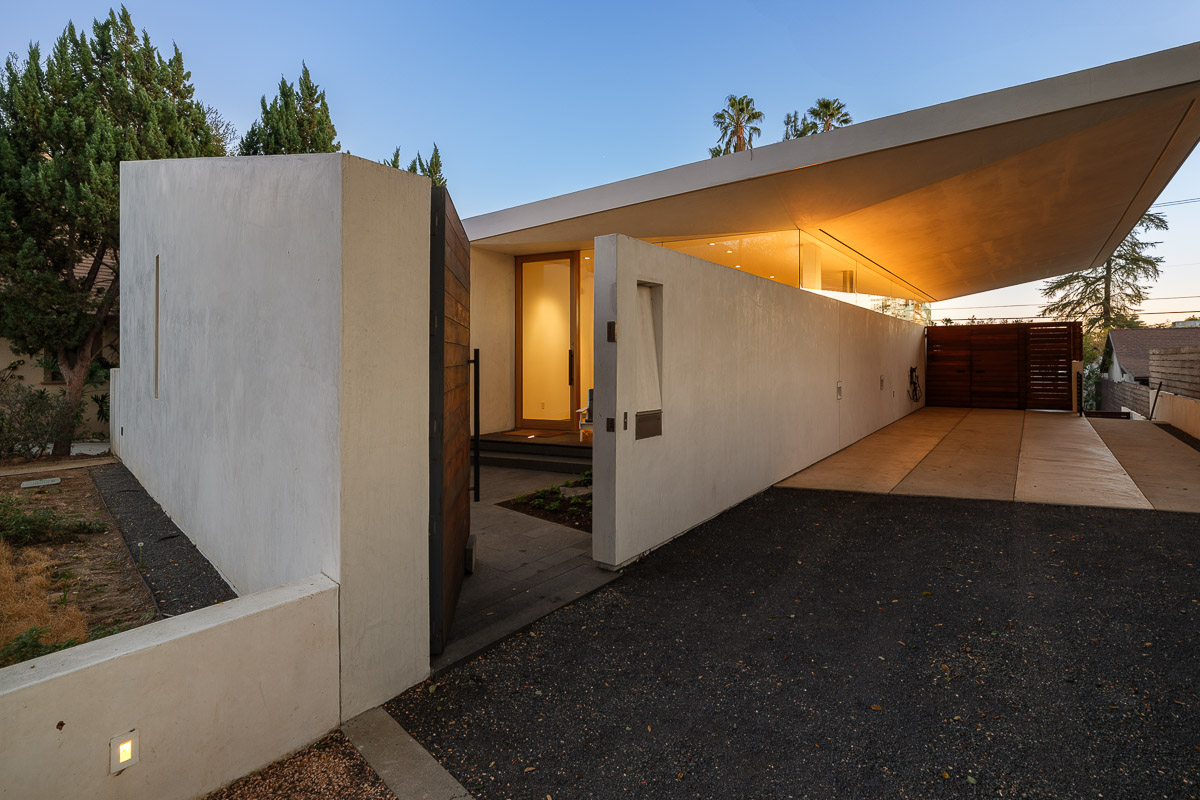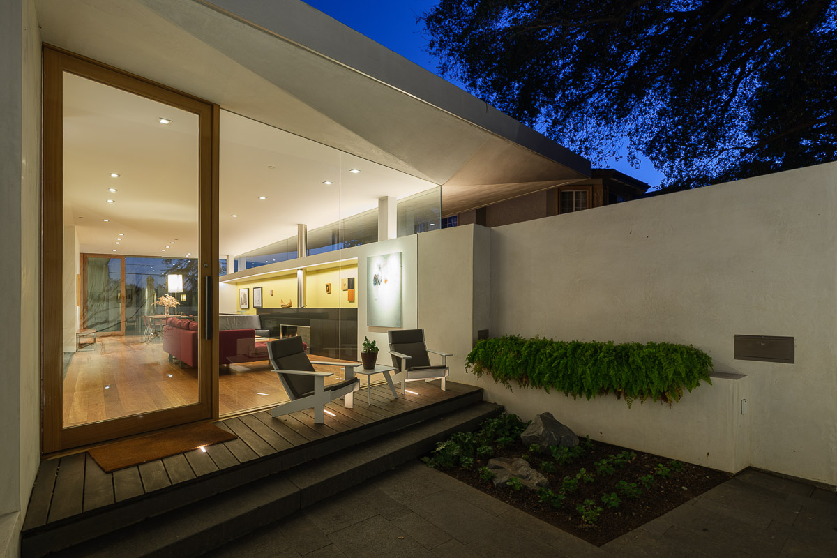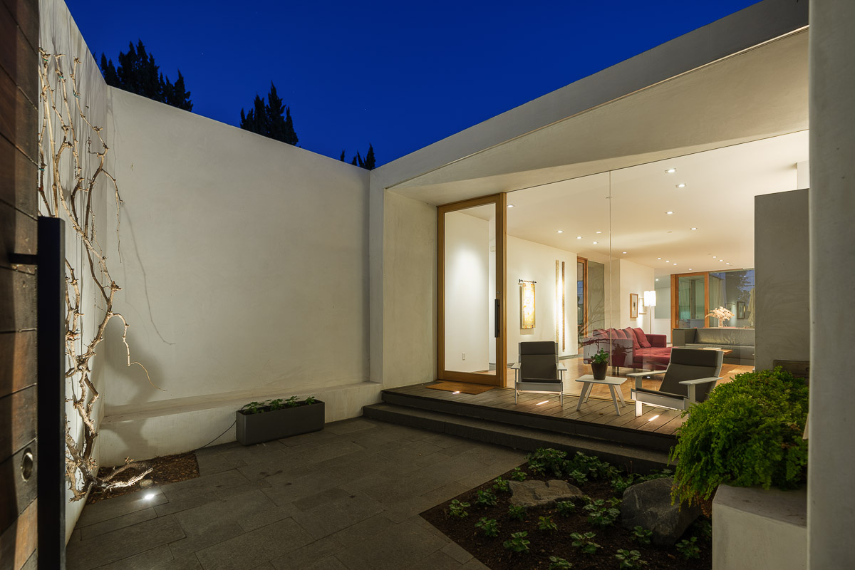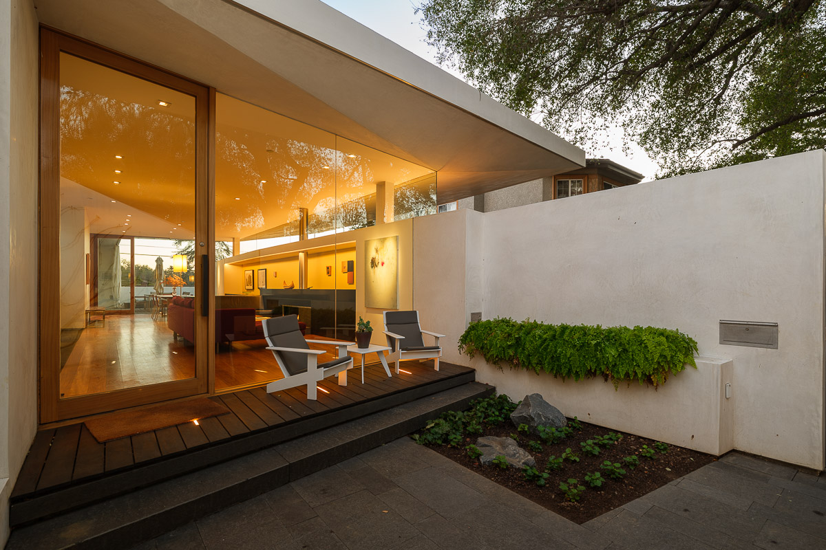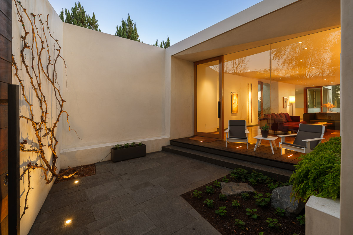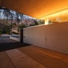 This home exudes sophistication, with a distinctive facade featuring a soaring cantilevered roofline and dramatic lighting. The curb appeal is unparalleled. The angled walls, basalt stone and Cumaru flooring effortlessly connect the inner spaces with outdoor gardens that wrap the structure, allowing for an easy grace when entertaining. Step into a world of modernist style as you enter the walled courtyard leading into the magnificent, light-filled entry. Once inside, you're beckoned in to the open floor plan that includes a living room, dining room, gourmet kitchen, family/media room, three bedrooms, one of which is a primary suite, and two and one-half bathrooms.