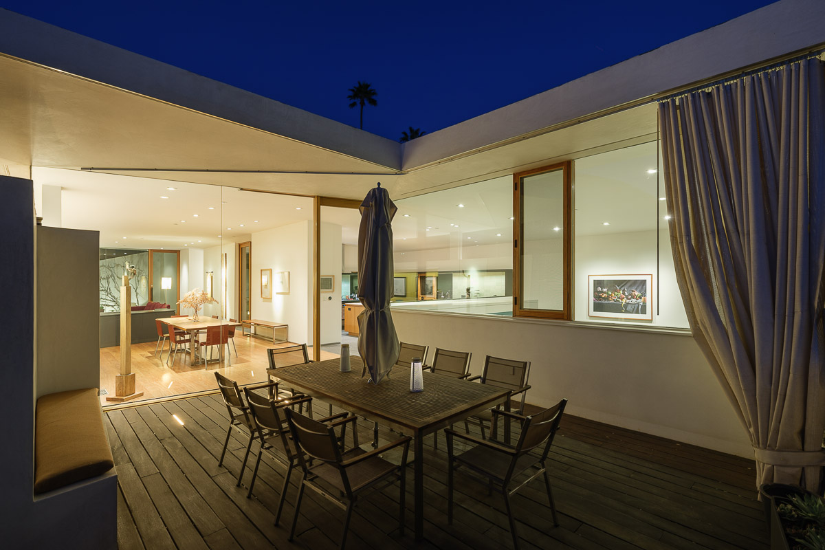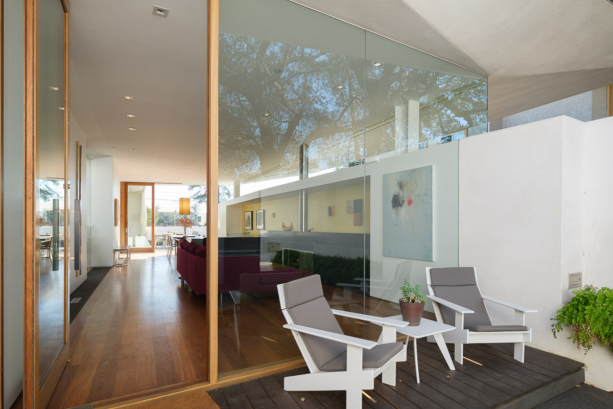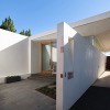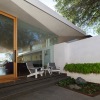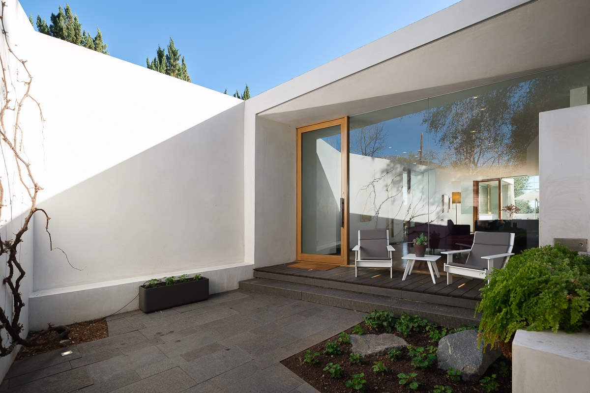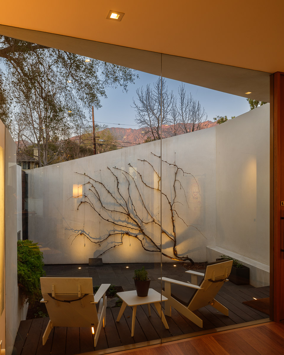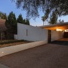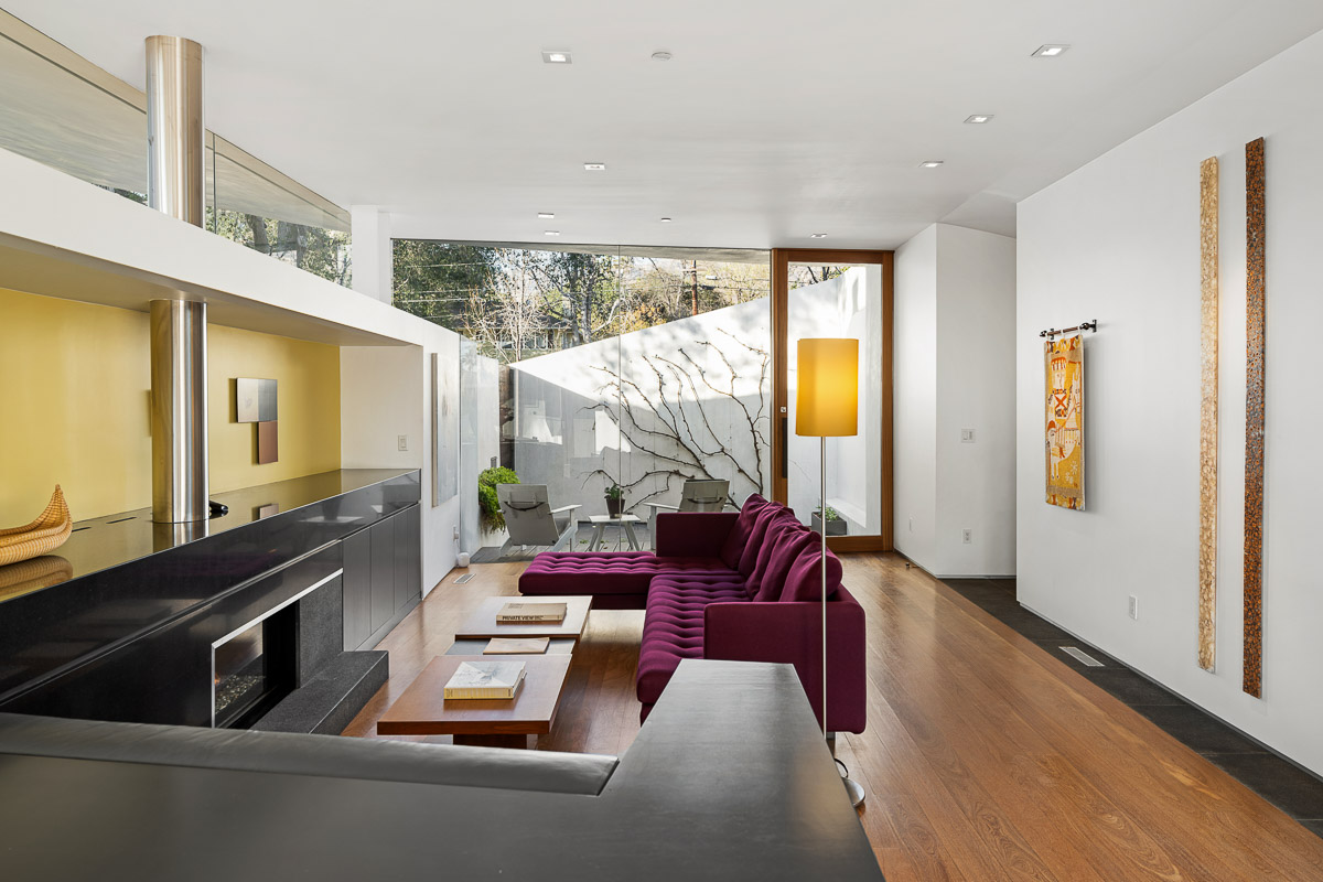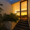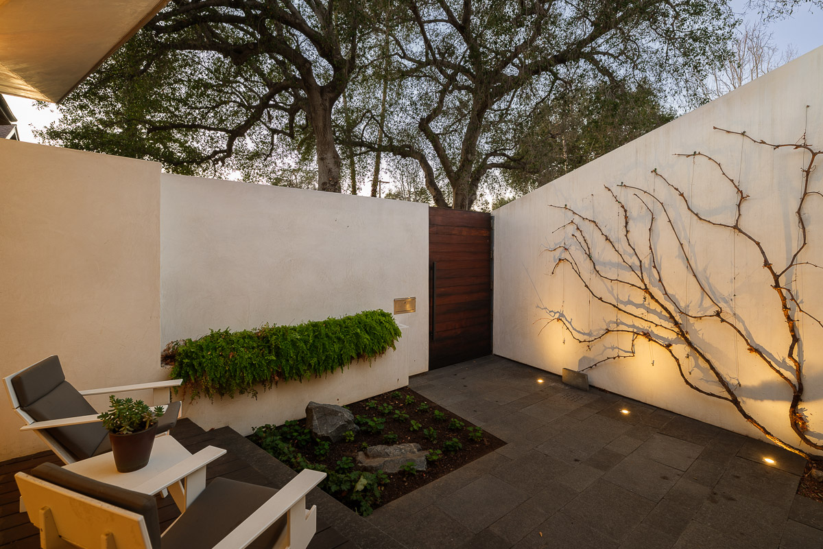 This home exudes sophistication, with a distinctive facade featuring a soaring cantilevered roofline and dramatic lighting. The curb appeal is unparalleled. The angled walls, basalt stone and Cumaru flooring effortlessly connect the inner spaces with outdoor gardens that wrap the structure, allowing for an easy grace when entertaining. Step into a world of modernist style as you enter the walled courtyard leading into the magnificent, light-filled entry. Once inside, you're beckoned in to the open floor plan that includes a living room, dining room, gourmet kitchen, family/media room, three bedrooms, one of which is a primary suite, and two and one-half bathrooms.